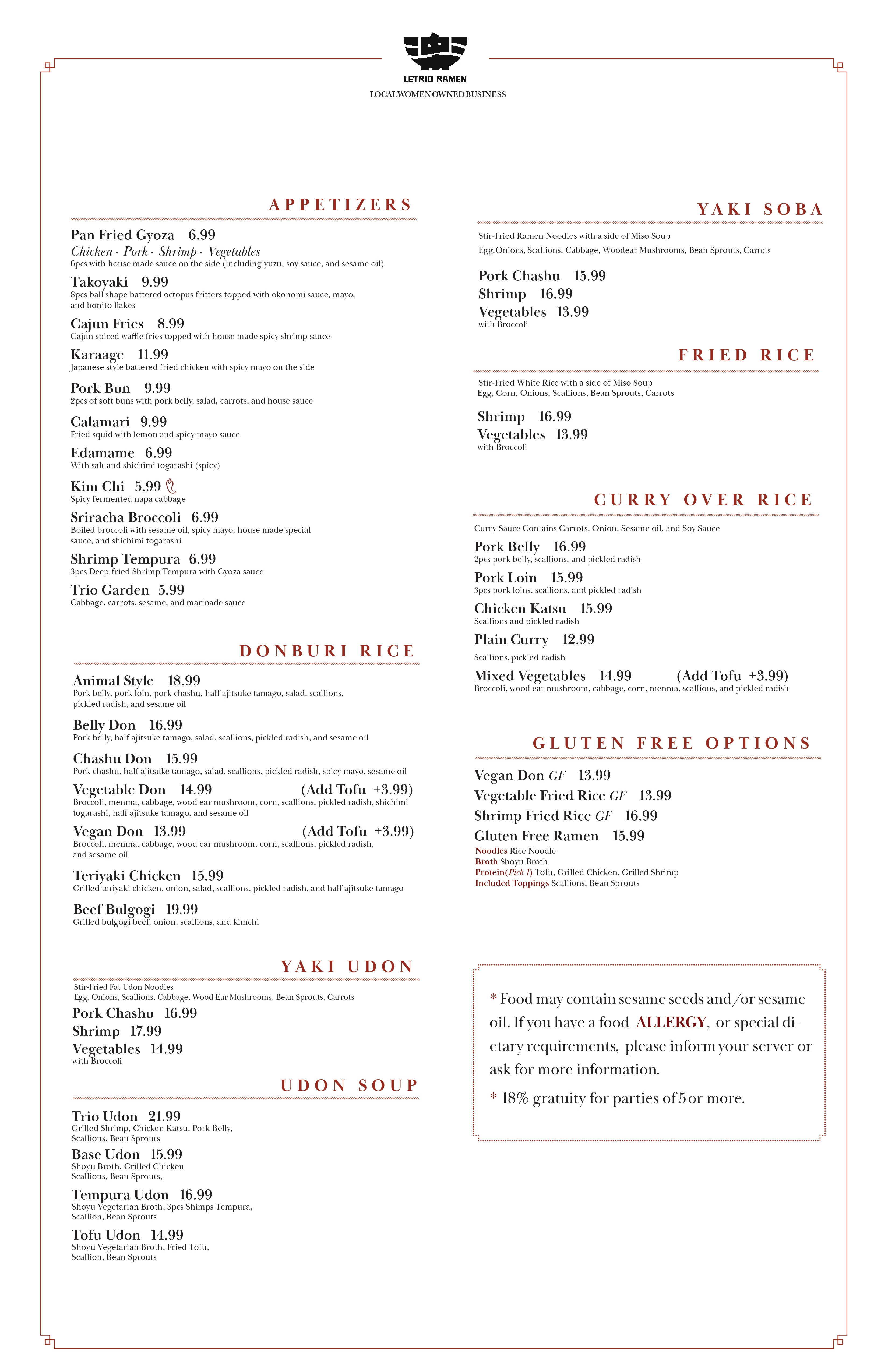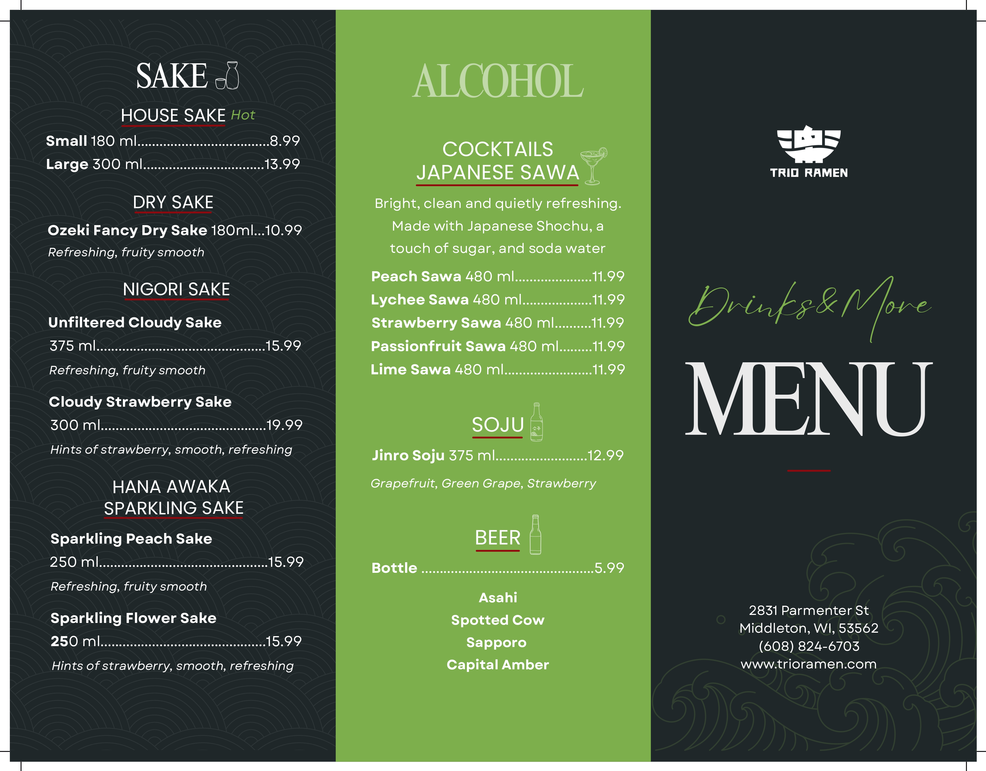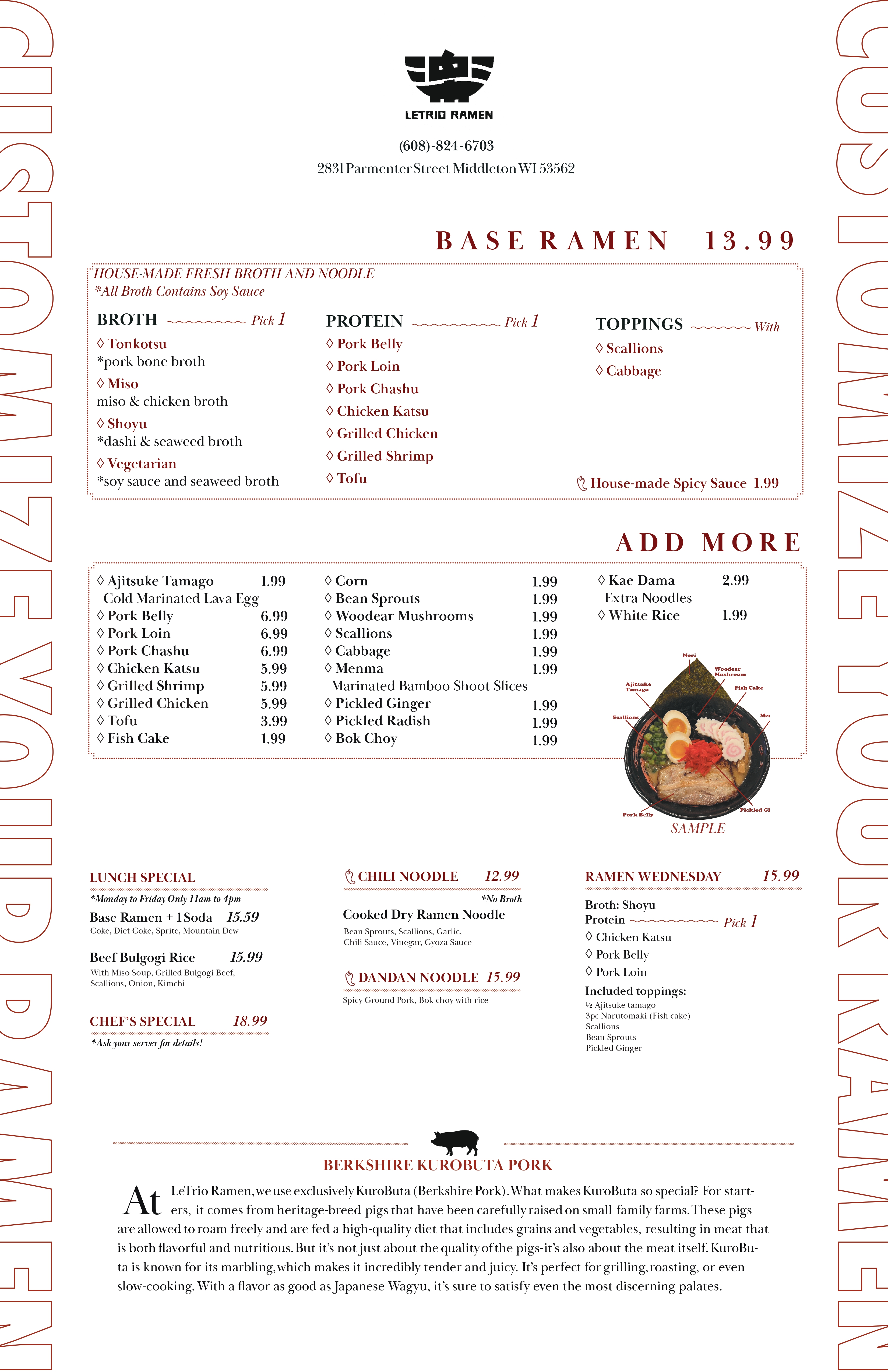 is a noodle soup dish that was originally imported from China in the 17th century, and has become one of the most popular dish in Japan. Best ramen is made with the best ingredients. At Trio Ramen, we used ingredients sourced straight from Japan. Ask your host about our process of making our broth.